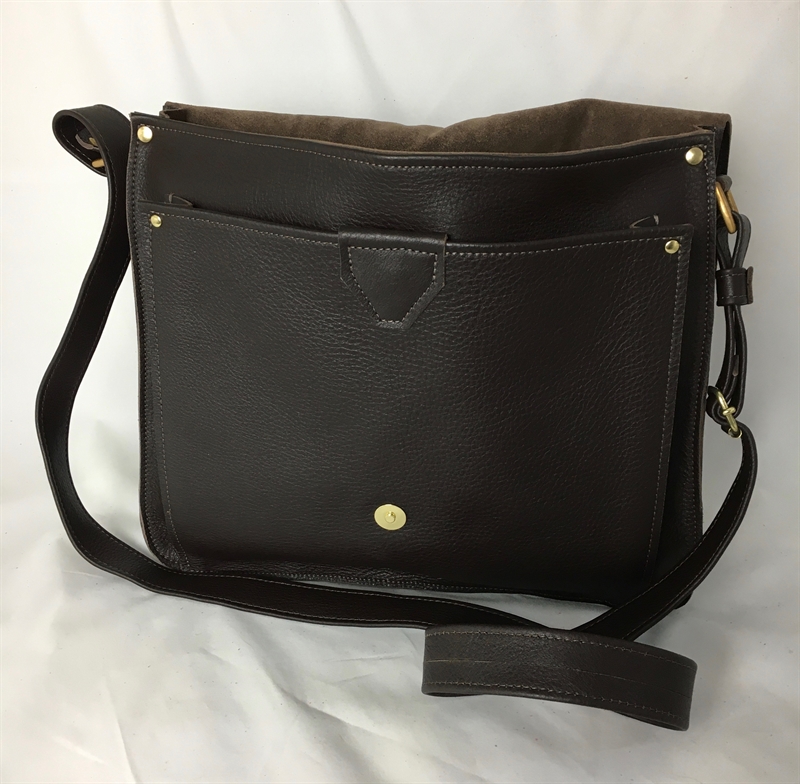 h26 w34 d8cms leather lined, internal zip pocket, magnetic catch on front pocket and external flap.